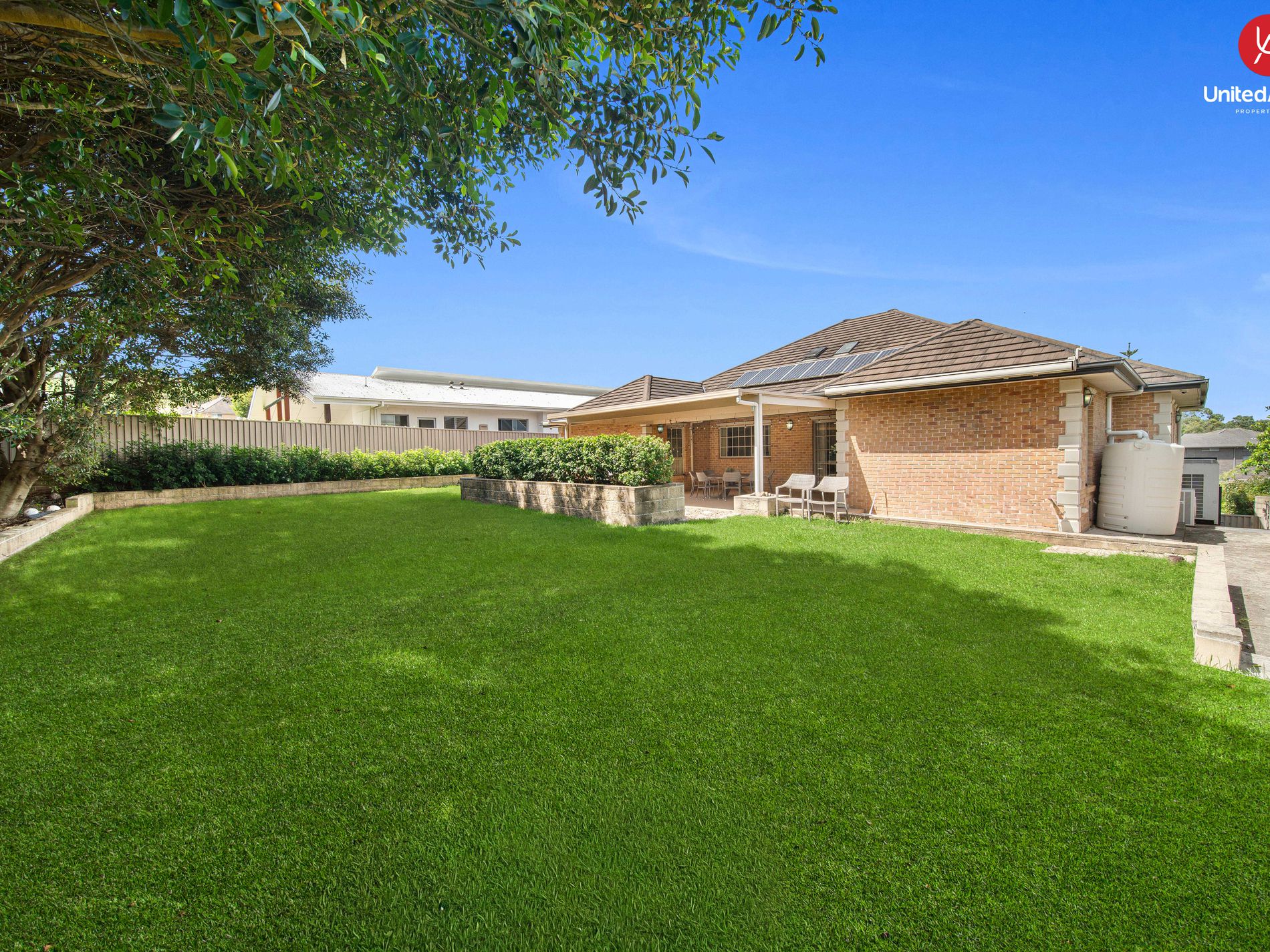 • Elevated backyard with large, well-maintained grass area